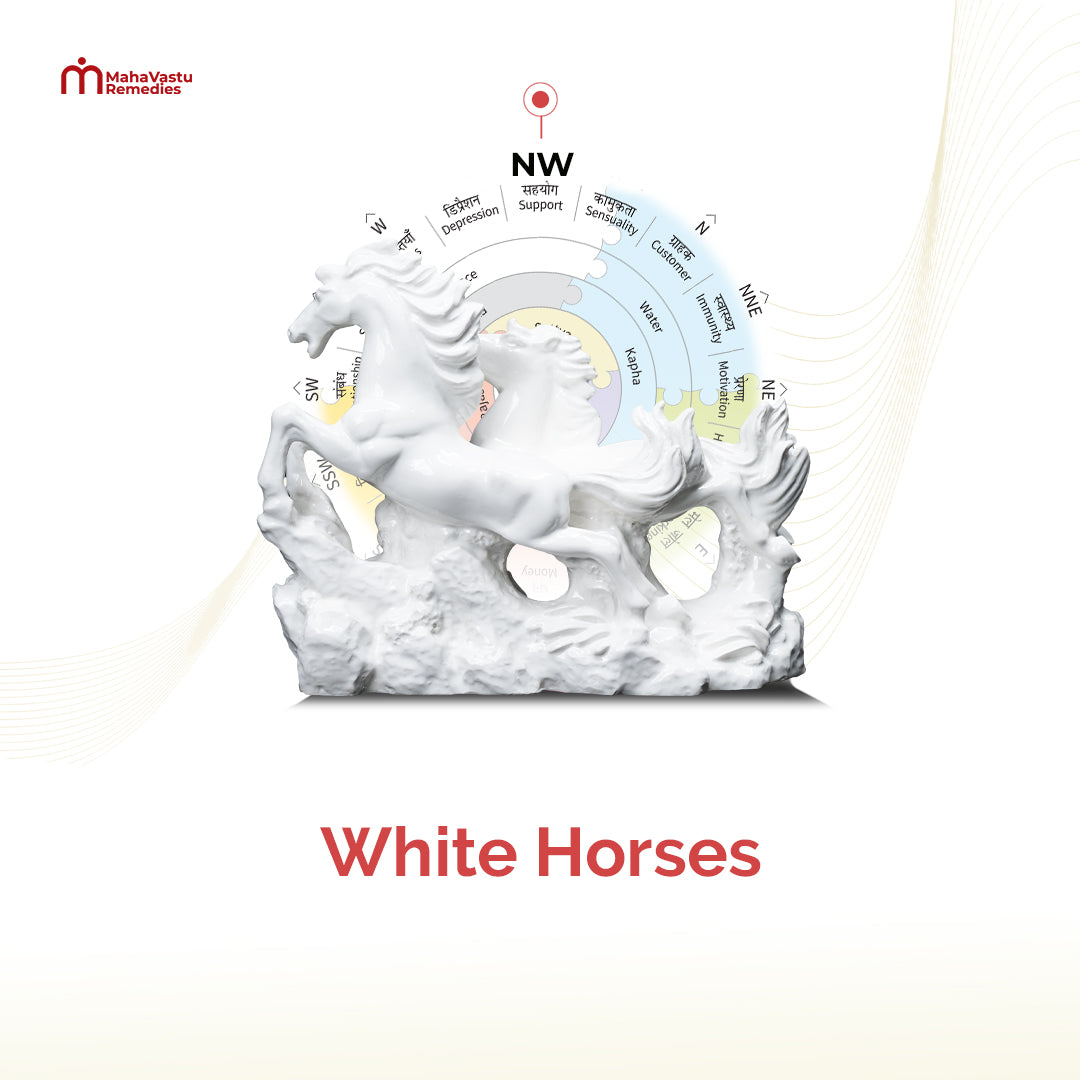 Running White Horses picture/ Statue an effective MahaVastu Remedy attracts financial support and smooth loan sanctions, removing money-related obstacles and enhancing fund flow, ideal for partnerships and salary increments.